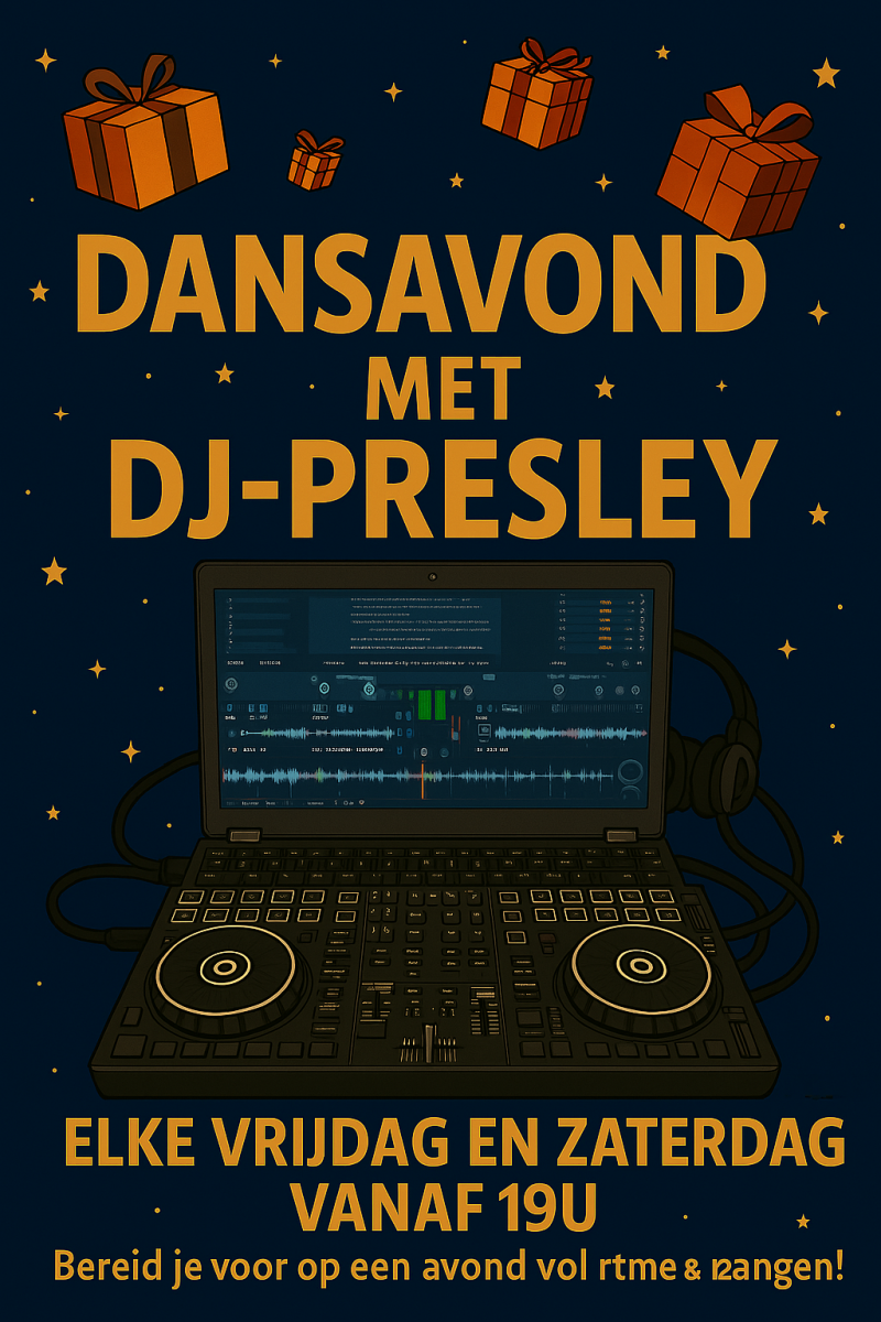 De deuren gaan open vanaf 19u-02u Ambiance verzekerd. Met de enige echte dj-presley. Mail ons gerust Info@dj-presley-top-20.be in samenwerking met feest mee met dj-muziekpiet www.feestmeemetdjmuziekpiet.online